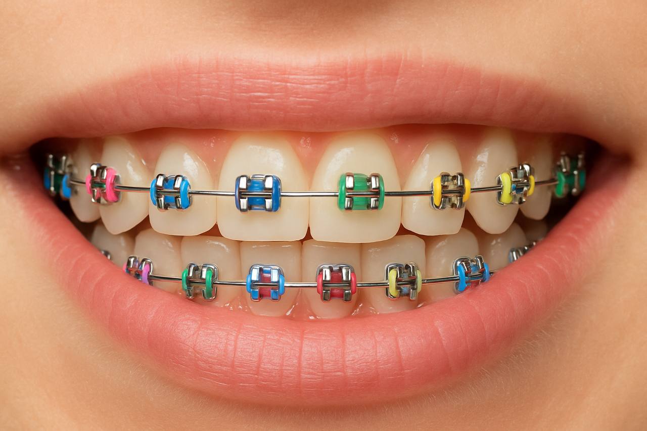 براکت ارتودنسی فلزی با کش‌های رنگارنگ روی دندان‌های فک بالا و پایین