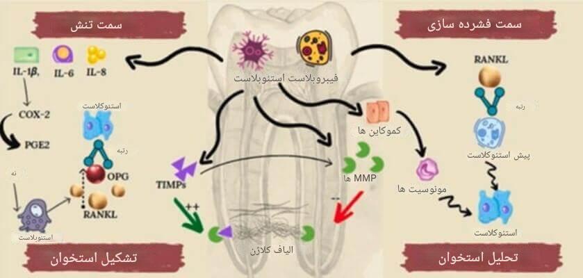 در ناحیهی فشاری، سلولهایی به نام استئوکلاستها فعال میشوند. این سلولها با تجزیهی استخوان موجود، فضا را برای حرکت دندان باز میکنند—فرآیندی که به آن تحلیل استخوانی (bone resorption) گفته میشود. در سوی دیگر، یعنی ناحیه کشش، استئوبلاستها به صحنه میآیند تا با ساخت ماتریس استخوانی جدید، استخوان تازه بسازند— فرآیندی موسوم به استخوانسازی (bone formation).
