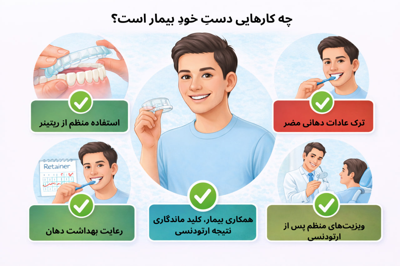 همکاری بیمار شامل استفاده منظم از ریتینر، ترک عادات دهانی مضر، رعایت بهداشت دهان و مراجعه‌های منظم پس از درمان، نقش کلیدی در جلوگیری از حرکت مجدد دندان‌ها دارد.